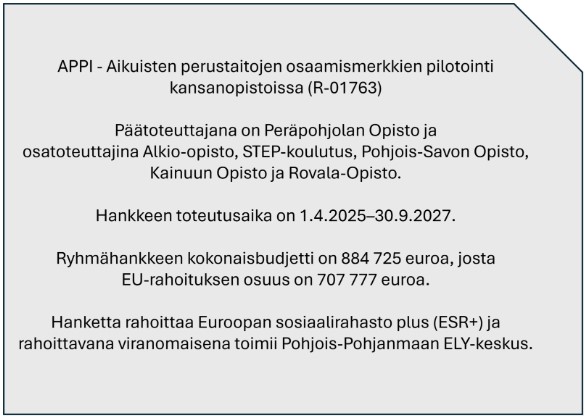 Digitaitoja-koulutus on osa valtakunnallista työtä aikuisten perustaitojen vahvistamiseksi. Peräpohjolan Opisto toimii APPI-hankkeen päätoteuttajana ja tekee kehittämistyötä yhdessä viiden muun kansanopiston kanssa. Hankkeessa pilotoidaan kansallisia perustaitojen osaamismerkkejä eli KAPOS-merkkejä, joiden teemoja ovat digitaidot, numero- ja taloustaidot sekä vuorovaikutus- ja työhyvinvointitaidot.